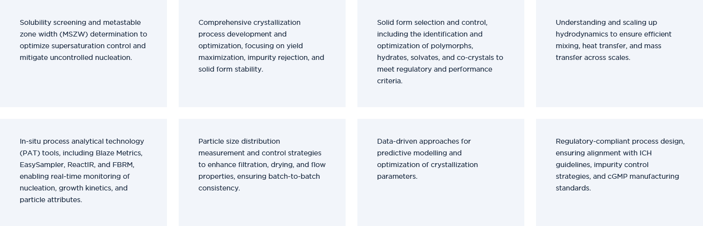 At Asymchem Sandwich, we leverage our world-class expertise, extensive experience, and state-of-the-art equipment to develop robust and scalable crystallization processes tailored to client and project needs. Our approach ensures seamless scale-up from laboratory development to commercial manufacturing while maintaining process consistency and efficiency. We focus on all aspects of the crystallization process to enhance both process robustness and downstream performance.
